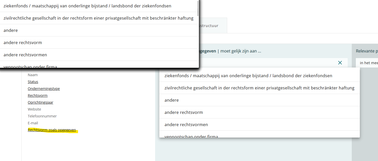 E.g. creating a filter with a “rechtsvorm zoals opgegegeven” spawns two search results, one in the top left and one in the right place and they’re both a bit buggy.